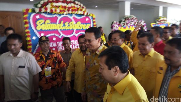Jajaran petinggi partai berlambang pohon beringin itu menyambut hangat Ahok saat hadir di acara Musda Golkar DKI yang digelar di kantor DPP, jalan Anggrek Neli Murni, Slipi, Jakarta Barat. Saat tiba pada pukul 11.05 WIB, Ahok disambut langsung oleh Ketua DPP Golkar Setya Novanto, Plt Ketua DPD Golkar DKI Yorrys Raweyai dan Ketua DPD Golkar Jawa Barat Dedi Mulyadi.