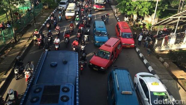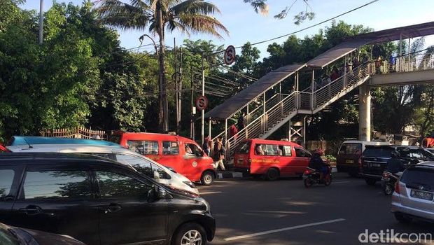 Angkutan umum itu menunggu penumpang yang turun dari JPO (jembatan penyebrangan orang) dari Stasiun Tanjung Barat. Imbas kepadatan dari kendaraan umum ngetem tersebut, ekornya mencapai 500 meter ke belakang. (dra/dra)