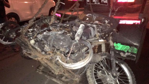 Sepeda motor yang dibakar saat bentrok suporter di GBK (Twitter TMC Polda Metro Jaya) |