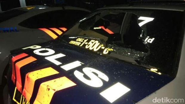 Dari foto yang diunggah akun twitter TMC Polda Metro Jaya, Sabtu (25/6/2016) pukul 03.57 WIB, tampak kaca mobil beberapa unit mobil patroli polisi yang terpakir pecah.
