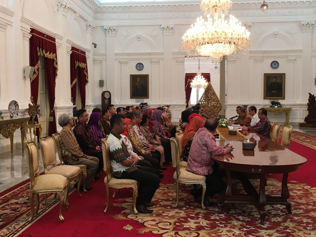 Jokowi menerima kedatangan APTHI di Istana Merdeka, Jl Medan Merdeka Utara, Jakarta Pusat, Selasa (28/6/2016). Pantauan detikcom, ada sekitar 20 orang yang diterima Jokowi di ruang tengah Istana Merdeka.