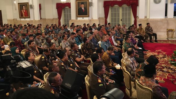 "Pertama saya ingin memberikan penghargaan, memberikan apresiasi yang tinggi atas prestasi-prestasi yang telah dicapai oleh Satgas 115, baik dalam menangkap kapal-kapal ilegal, kapal-kapal asing ilegal, dan juga dalam menjaga sumber daya laut kita menuju visi maritim Indonesia," kata Jokowi membuka pidatonya.