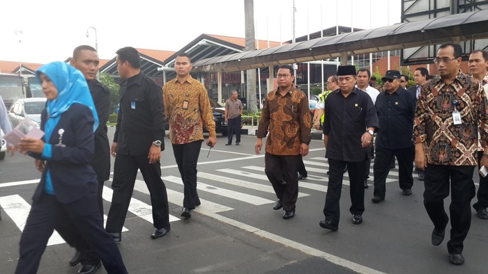 Pria yang akrab disapa Akom itu pertama mengecek Terminal 1 Bandara Soekarno-Hatta, Tangerang, Banten, Rabu (29/6/2016). Didampingi Dirut Angkasa Pura II Budi Karya, ia pun berkeliling menyapa para penumpang.