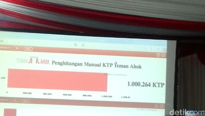 Hitung manual yang dilakukan di Sekretariat Teman Ahok di Pejaten, Pasar Minggu, Jakarta Selatan, Rabu (30/6/2016) mencapai angka 1 juta pada pukul 17.45 WIB. Jumlah surat dukungan yang terverifikasi secara manual ditampilkan di layar.