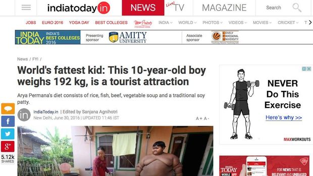Ariya juga jadi perhatian media Malaysia dan India. Malaysia Digest dan India Today memberitakan dengan tone yang sama pada Kamis, 30 Juni 2016. Mereka menyebut Ariya sebagai bocah raksasa yang harus diet agar tetap hidup.