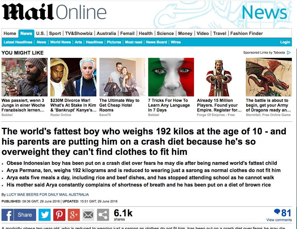Media Inggris lainnya, the Sun, cenderung menyoroti efek kegemukan Ariya. Dituliskan, bocah yang kini belajar di rumah itu tak bisa berjalan ke sekolah, orangtuanya khawatir anaknya meninggal, dan kebiasaan makan 5 kali sehari.