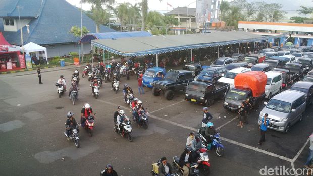 Sementara di areal pelabuhan terlihat penuh kendaraan yang antre masuk ke kapal. Petugas kepolisian dan petugas pelabuhan sibuk mengatur kendaraan yang sudah membeli tiket penyebrangan.