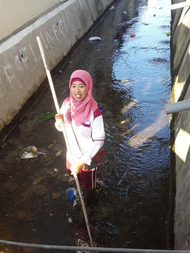 Berbekal seragam tenaga harian lepas (THL) Dinas Kebersihan dan Pertamanan (DKP), dan 'senjata pamungkas' berupa sepatu boots serta sapu drainase, Nur Hamidah (34) masuk ke Kali Pujasera yang tepat bersebelahan dengan pasar tradisional tersebut.