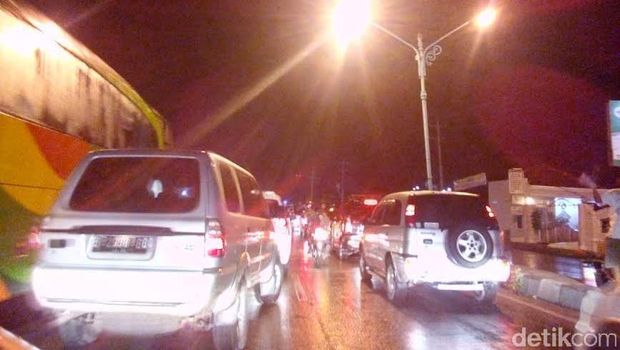 Kondisi jalan basah selepas hujan. Kendaraan di jalan didominasi pelat Jakarta. Namun kondisi ini lebih baik dibanding kemarin di mana kendaraan benar-benar tak bergerak. (irw/dra)