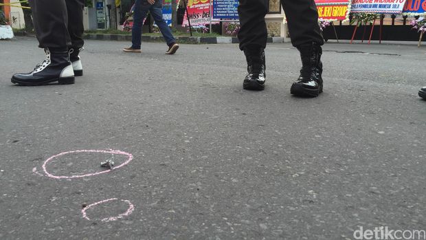 Sebanyak dua buah gotri dan sebuah baut ditemukan di 15 meter jelang gerbang masuk Mapolresta Surakarta, Selasa (5/7/2016). Benda-benda itu kemudian dilingkari oleh polisi menggunakan kapur berwarna.