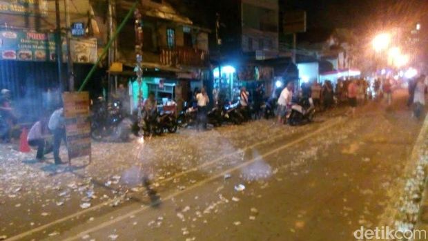 Selama empat menit, petasan pun habis. Bau mesiu menyeruak dan potongan kertas menyampah di aspal. Kendaraan pun kembali melintas setelah jalan dibuka.