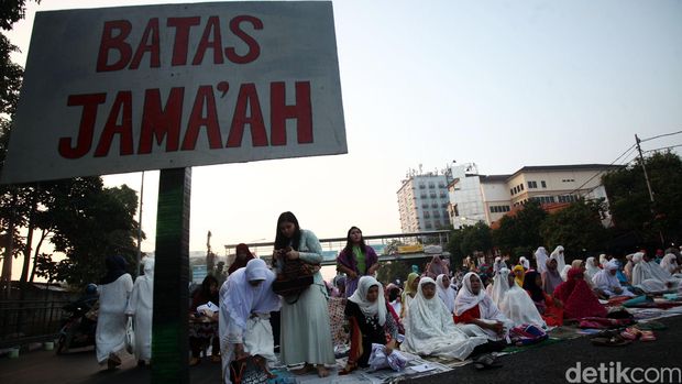 Salah digelar di Jl Jatinegara Barat dan di Jl Matraman Raya. Meski di atas aspal, jamaah tampak khusyuk melaksanakan salat.