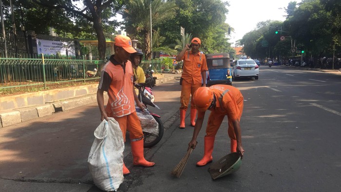 Sampah sisa malam takbiran yang dirayakan oleh warga ibukota, hingga kertas koran serta plastik bawaan para jamaah usai melaksanakan salat Id pagi tadi, diangkut oleh tim pasukan oranye. Seperti yang terlihat di sepanjang Jalan Taman Wijaya Kusuma, tepatnya di depan Masjid Istiqlal,Jakarta Pusat.