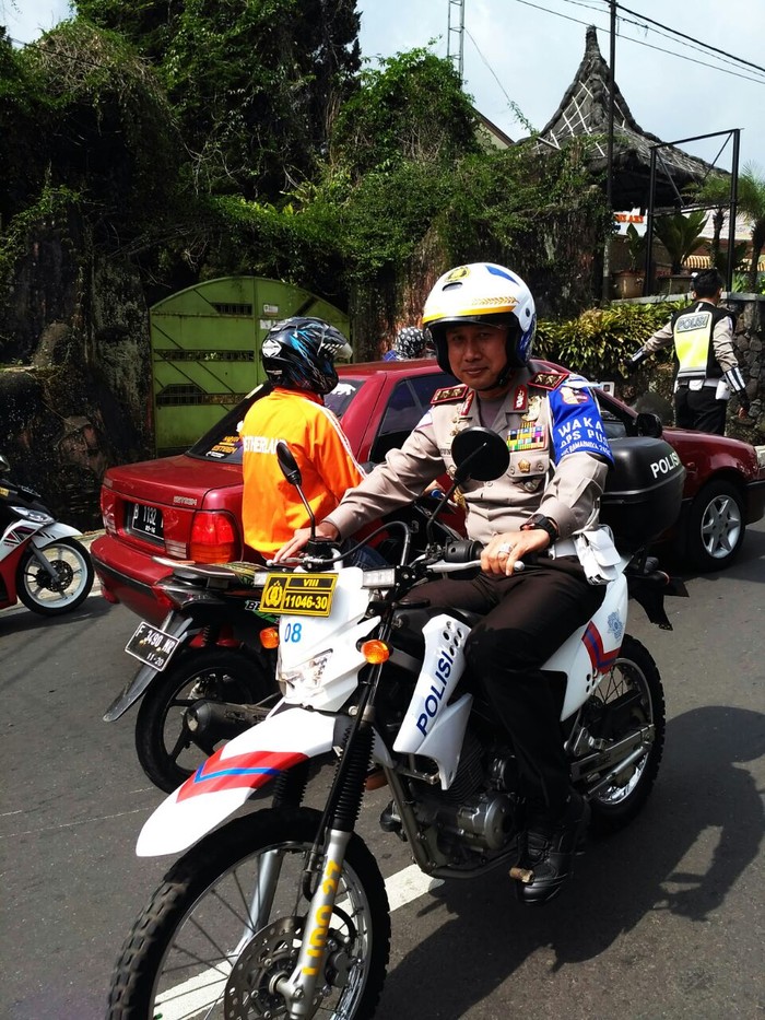 Irjen Agung memilih mengendarai sepeda motor trail untuk memantau kemacetan di jalur Puncak. Kapolres Bogor AKBP Suyudi juga ikut mendampingi pemantauan lalin.