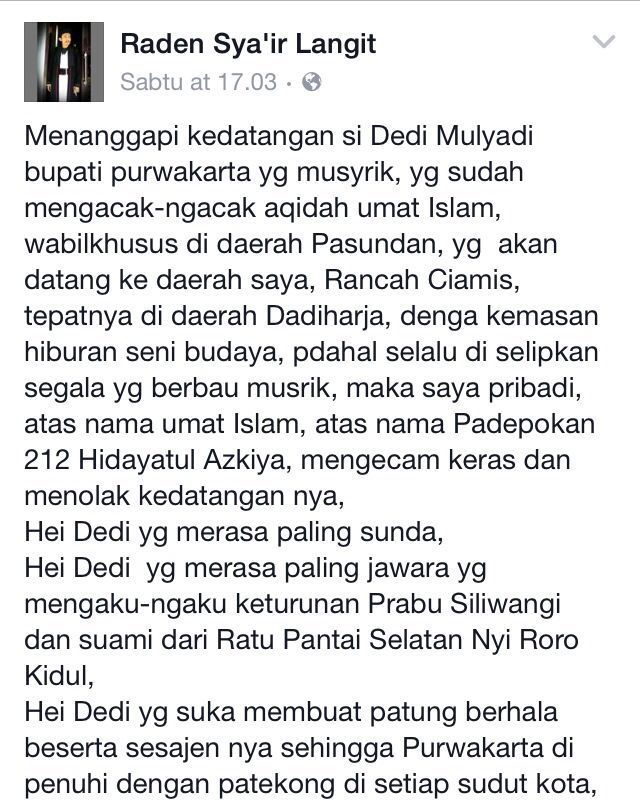 "Saya tidak ridho anda menginjak kaki di tanah Galuh ini. Monggo saya tunggu anda jika tetap nekad datang kesini, jika selama ini anda paling jawara, saya ajak anda satu lawan satu debat mulut atau tangan dengan saya. Saya berharap kepada seluruh elemen masyarakat, ormas islam, ormas nasional, ormas lokal, tokoh ulama, tokoh masyarakat yg masih peduli terhadap aqidah Agama Islam, untuk bersatu padu menolak kedatangan si Dedi Musyrik di tanah Galuh, Rancah Ciamis ini," tulis Raden dalam penggalan postingannya.