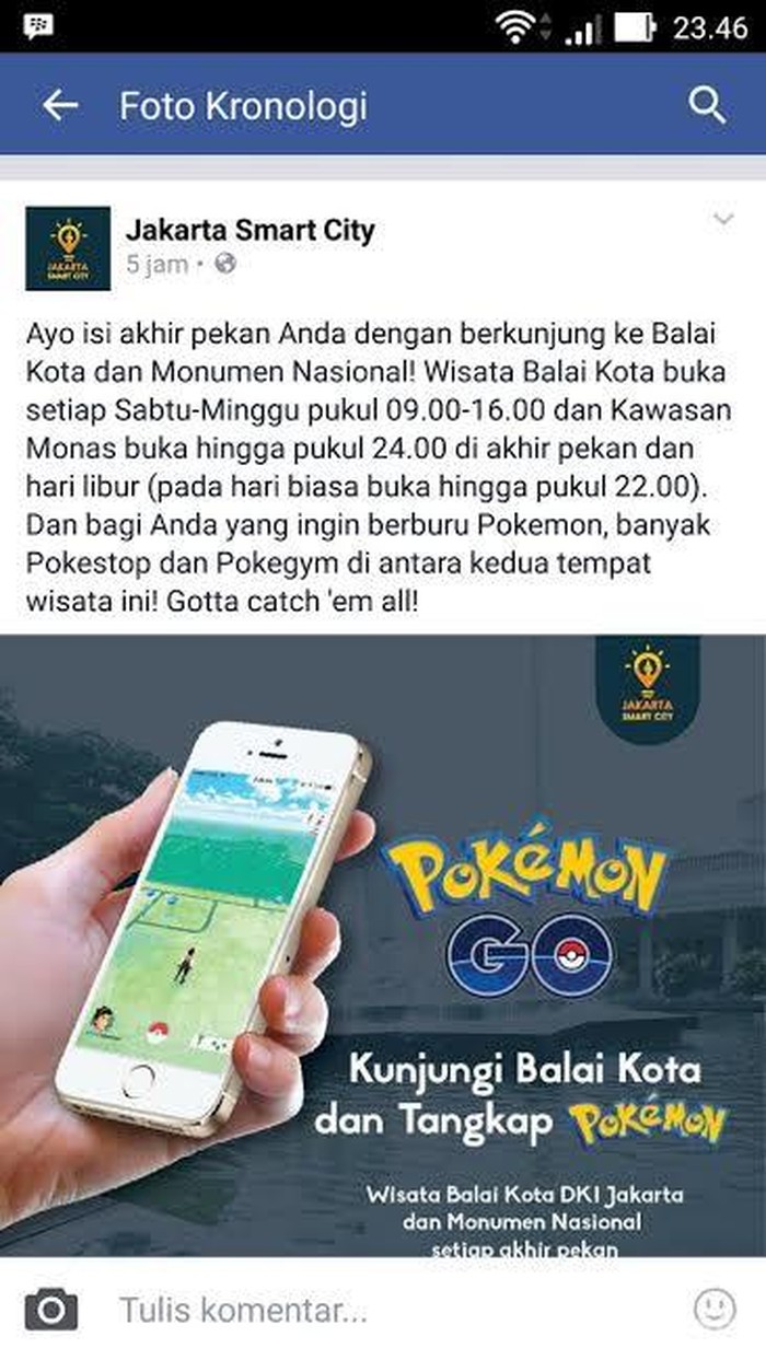 "Ayo isi akhir pekan Anda dengan berkunjung be Balai Kota dan Monas!," tulis Jakarta Smart City di Laman facebook-nya, Jumat (15/7/2016).