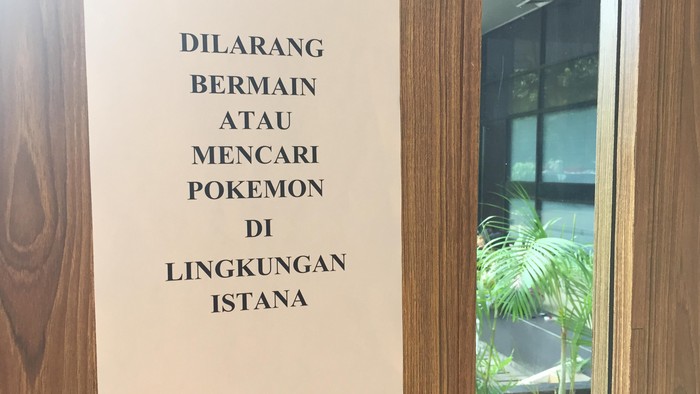 "Dilarang bermain atau mencari Pokemon di lingkungan Istana," demikian bunyi larangan yang ditempel di beberapa tempat di kompleks Istana Kepresidenan, Jakarta, Rabu (20/7/2016).