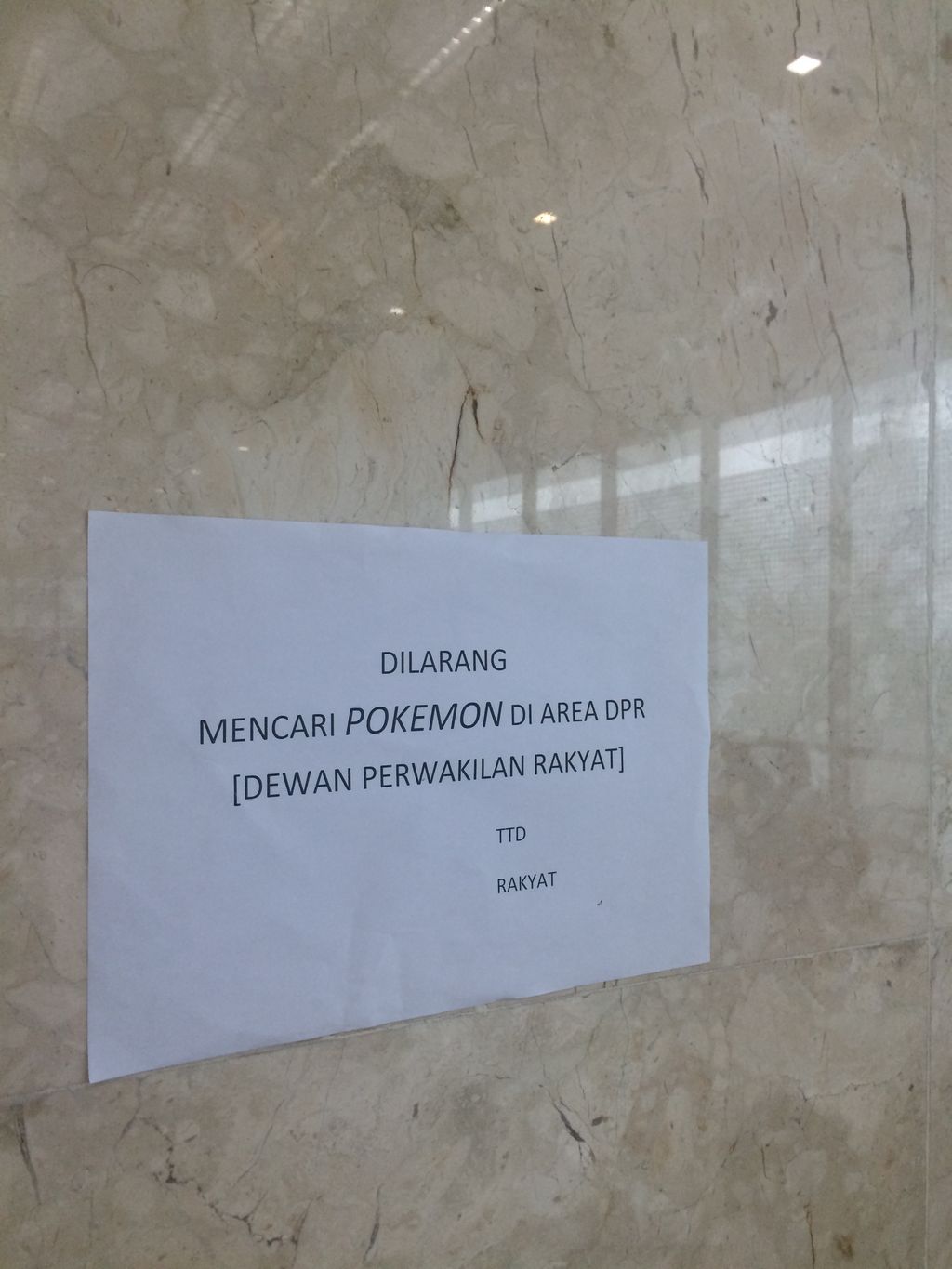 "Dilarang mencari Pokemon di area DPR (Dewan Perwakilan Rakyat). Ttd, Rakyat," demikian tulisan di kertas putih polos itu.