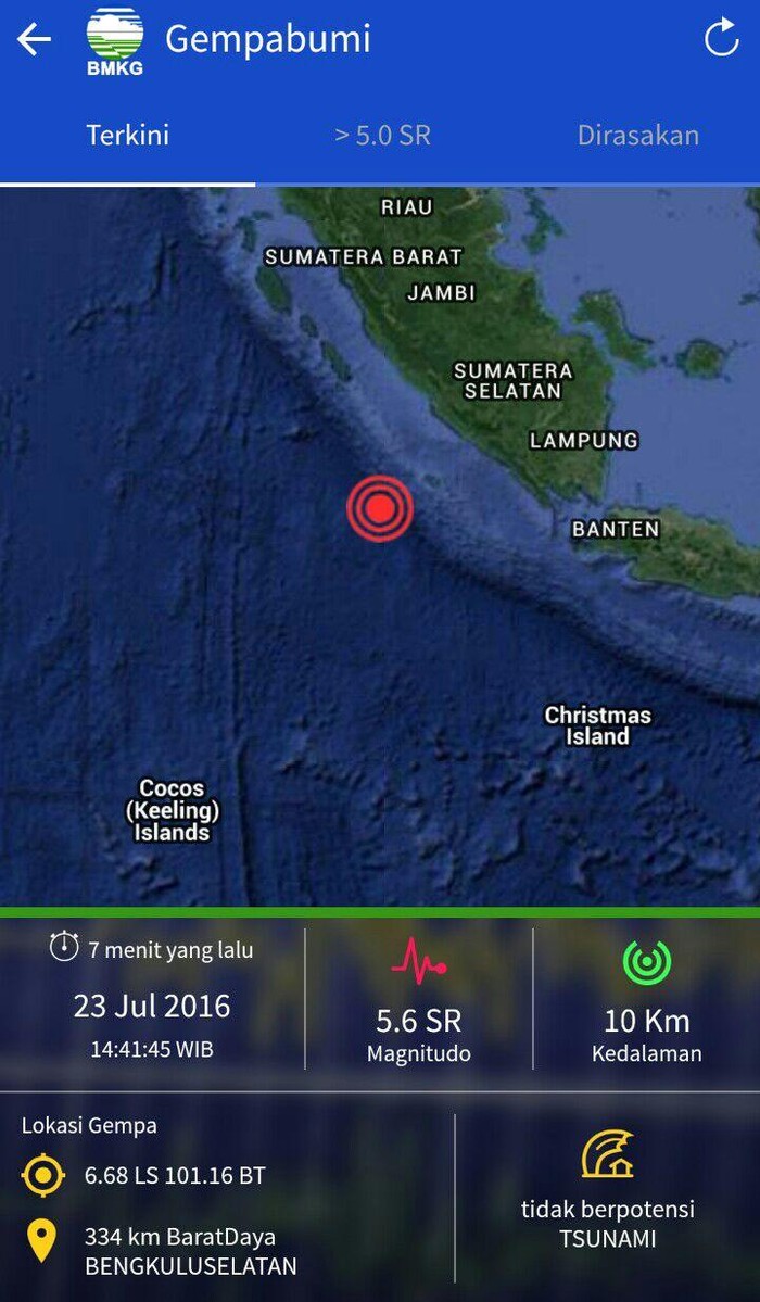 Informasi dari BMKG, Sabtu (23/7/2016), pusat gempa berada di Bengkulu Selatan. Gempa ini berkekuatan 5,6 SR dengan kedalaman 10 Km.