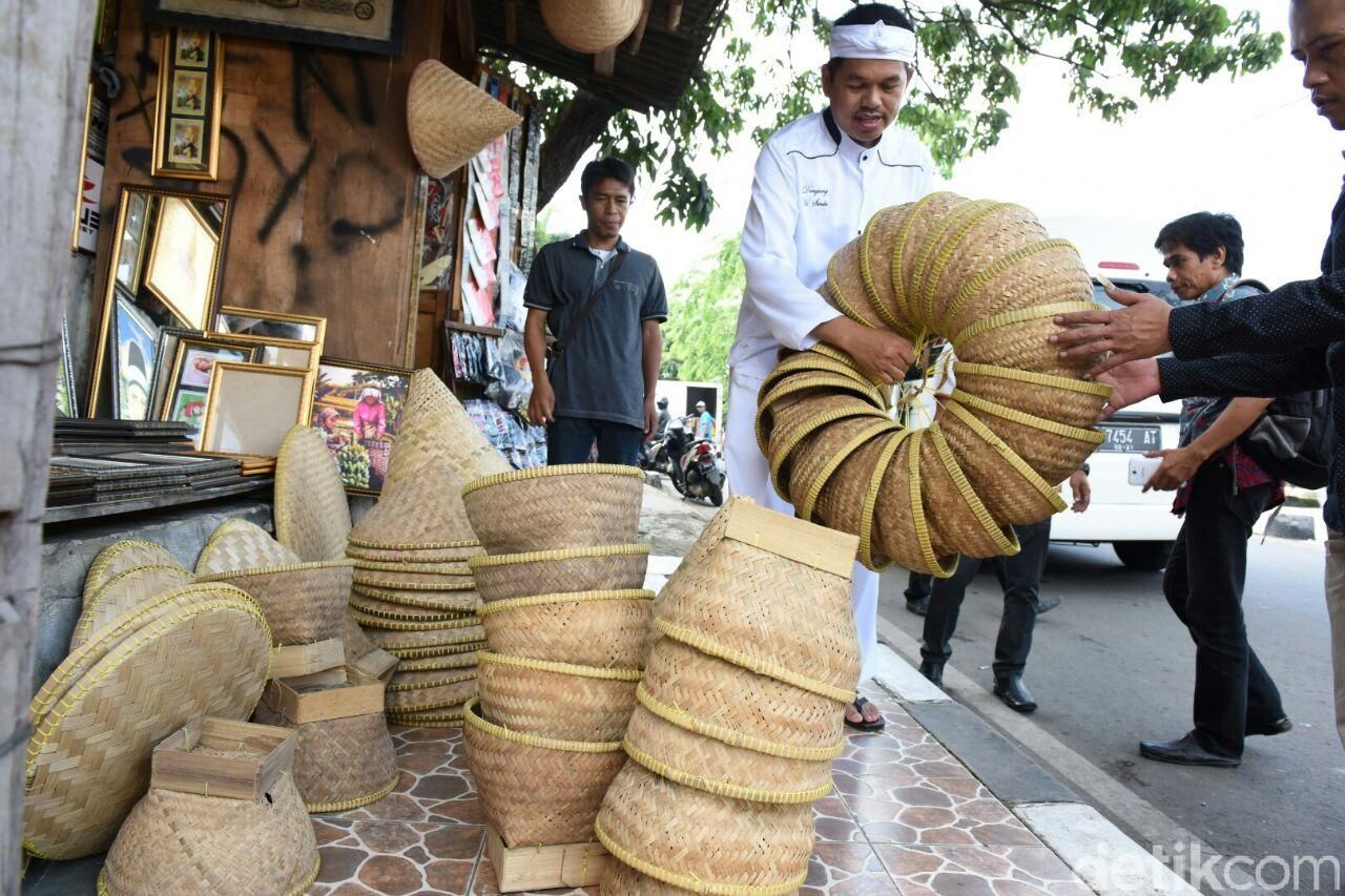 Tidak hanya Acep, Abah Karman yang sehari-hari berjualan sapu keliling pun untuk sementara beralih profesi sebagai penjual aneka barang kebutuhan yang berbahan baku bambu tersebut.