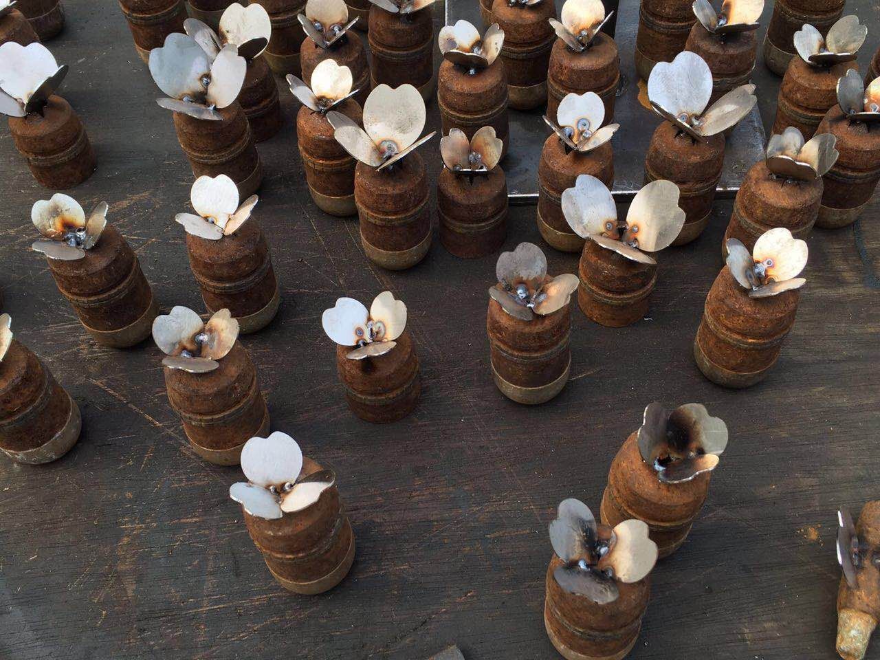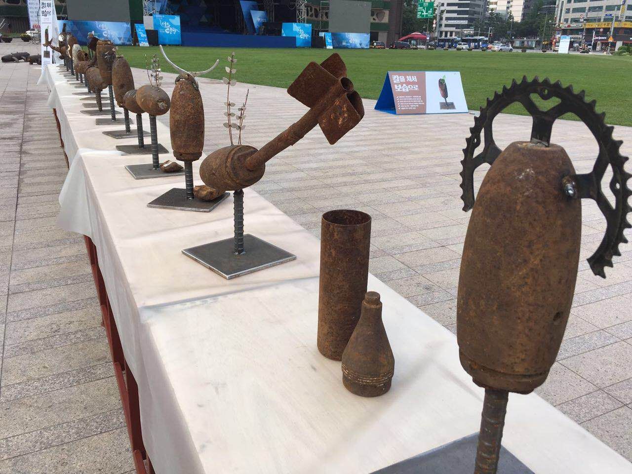 Selama seminggu ini, di depan city hall Seoul dipamerkan aneka selongsong peluru karatan. Bukan hanya pelor kosong, namun juga mortir kosong, granat rusak dan lainnya. Ada yang ditumpuk begitu saja, namun tidak sedikit yang ditata dan dijejer apik di atas meja. Unik.