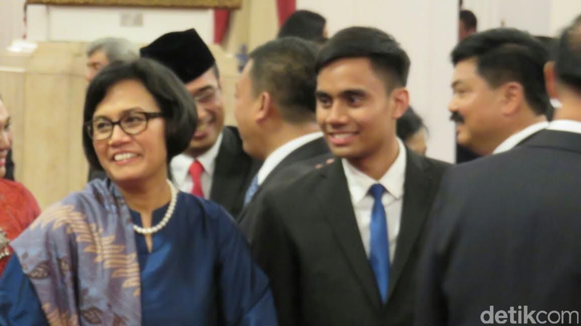 Ditemani putranya Sri Mulyani menebar senyum. Beberapa yang hadir usai pelantikan sempat mengajaknya berfoto selfie. Wartawan juga menyerbu Sri Mulyani dengan aneka pertanyaan.