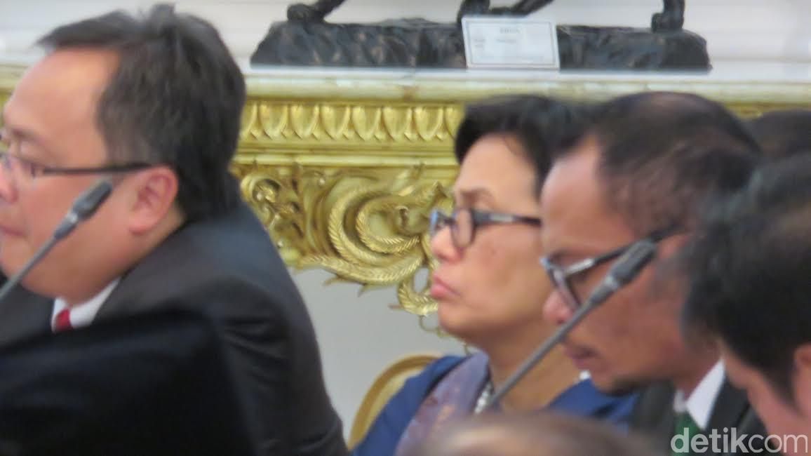 Usai pelantikan, Sri Mulyani ikut rapat bersama menteri kabinet yang lain. Dia duduk di sebelah Menkeu sebelumnya yang digantikannya Bambang Brodjonegoro.