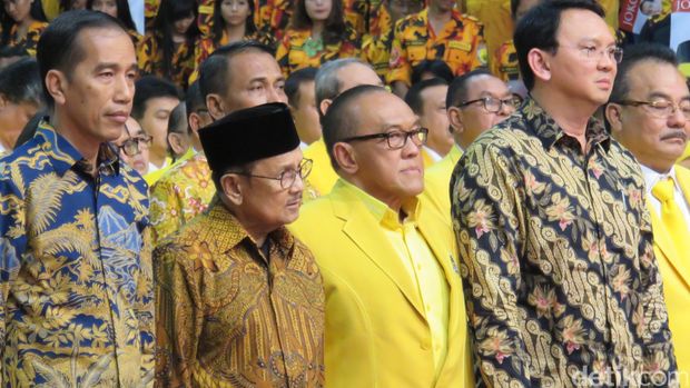 Saat tiba di ruangan, Jokowi duduk di antara Setya Novanto dan Ketua Wanhor Golkar BJ Habibie yang merupakan Presiden ke-3 RI. Mega duduk beberapa kursi lebih jauh dari Jokowi.