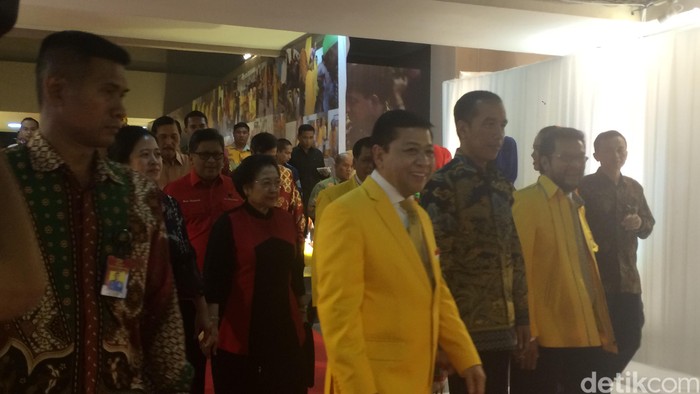Saat itu, Kamis (28/7/2016) pukul 19.45 WIB, Ketum Golkar Setya Novanto bersama jajarannya serta Menko Kemaritiman Luhut Pandjaitan sudah bersiap di pintu masuk Istora Senayan. Yang turun dari mobil istana ternyata bukan hanya Jokowi, melainkan juga ada Megawati dan Gubernur DKI Jakarta Basuki Tjahaja Purnama.