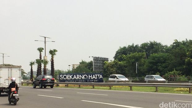 Saat memasuki kawasan bandara Soekarno-Hatta, kita akan langsung disambut oleh tulisan 'Soekarno-Hatta International Airport' berwarna silver dengan latar biru. Patung Soekarno-Hatta awalnya berada di kawasan itu kini dipindahkan ke taman air mancur kawasan Terminal 3.
