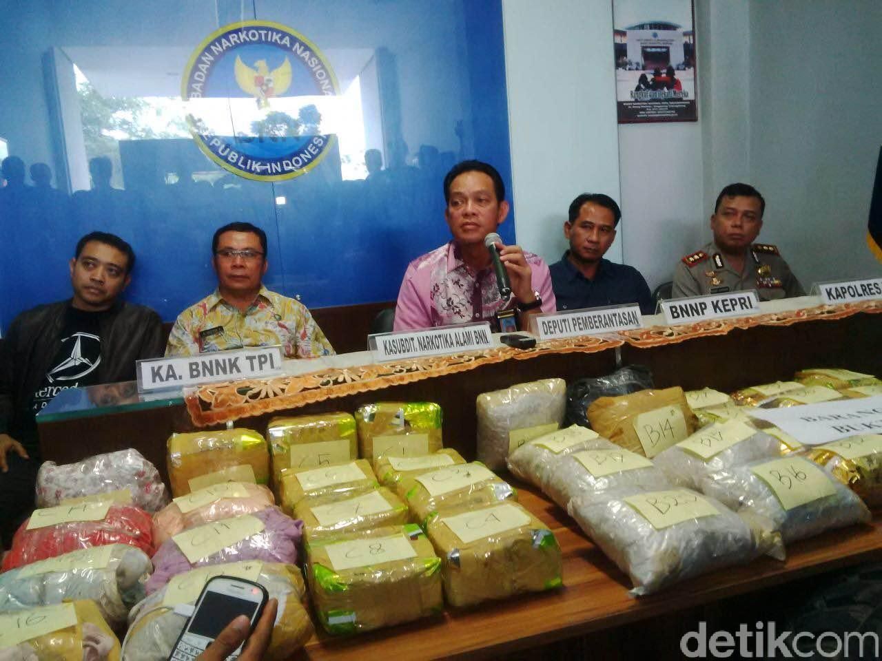 Barang bukti dan 2 'bandar' ditampilkan saat Deputi Bidang Pemberantasan BNN Irjen Arman Depari memberikan keterangan di kantor BNNK Tanjungpinang, Jl Daeng Kamboja, Kecamatan Senggara, Kota Tanjungpinang, Jumat (5/8/2016).