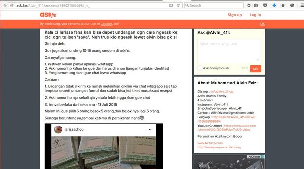 Ternyata pengikut Alvin di ask.fm juga menagih undangan yang sama. Alvin kemudian membagikan 15 undangan kepada pengikutnya di media sosial itu secara acak lewat ask.fm per 13 Juli 2016.