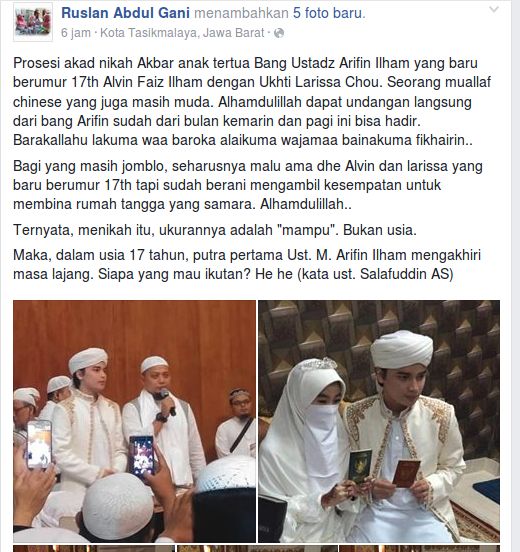 "Bagi yang masih jomblo, seharusnya malu ama dhe Alvin dan larissa yang baru berumur 17th tapi sudah berani mengambil kesempatan untuk membina rumah tangga yang samara. Alhamdulillah. Ternyata, menikah itu, ukurannya adalah "mampu". Bukan usia," tulis Ruslan.