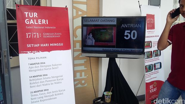 Pengamatan detikcom, Minggu (7/8/2016) di Galeri Nasional Indonesia yang terletak di seberang Stasiun Gambir, Jalan Medan Merdeka Timur, Jakarta Pusat, sekitar pukul 12.20 WIB antrean pengunjung yang ingin melihat lukisan koleksi Istana sudah mencapai 3 meter. Para pengunjung diharuskan untuk melakukan registrasi dan mengambil nomor antrean untuk masuk.