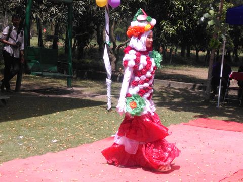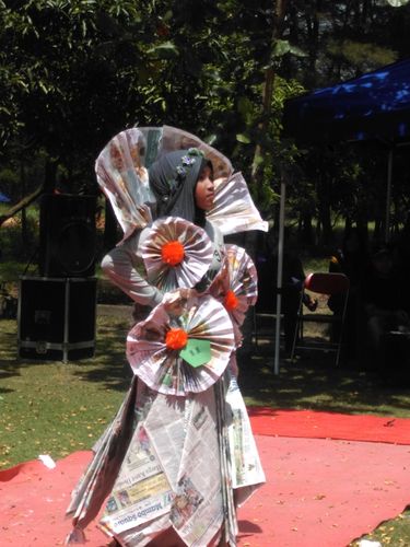 Mengenakan pakaian berbahan bekas dengan desain unik, para peserta peragaan busana melenggak-lenggok di karpet merah yang digelar di atas rumput BBG. Berbagai desain unik itu antara lain setelah jas pria berbahan kantong keresek hitam lengkap dengan dasinya, rompi berbahan bungkus plastik minuman ringan yang dijahit rapi dan pakaian adat Melayu yang juga berasal dari bungkus makanan bekas.
