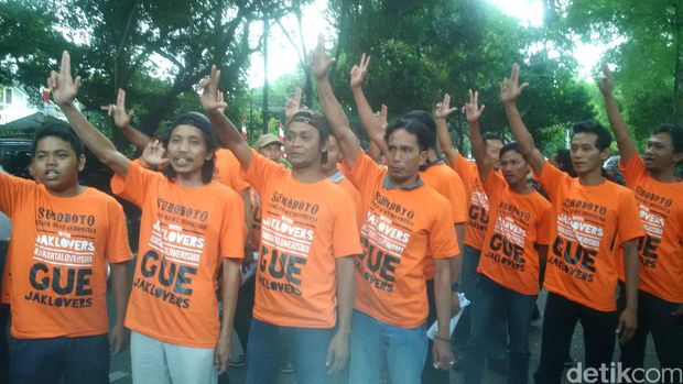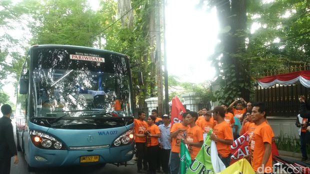 Massa yang berkaos oranye itu tiba di seberang rumah Megawati di Jl Teuku Umar, Jakarta Pusat, sekitar pukul 16.42 WIB, Minggu (7/8/2016). Jumlah mereka sekitar 43 orang yang menumpang satu bus besar. Setelah bus terparkir, mereka turun dan berjalan kaki sambil membawa spanduk mengarah ke depan rumah Mega persis.