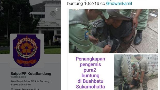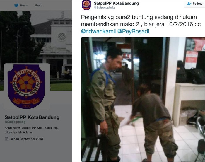 "Pengemis yg pura2 buntung sedang dihukum membersihkan mako 2 , biar jera 10/2/2016 cc @ridwankamil @PeyRosadi pic.twitter.com/ii9HzO7aY7," tulis @Satpolppbdg.