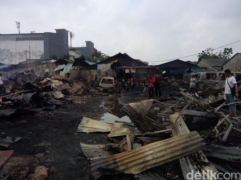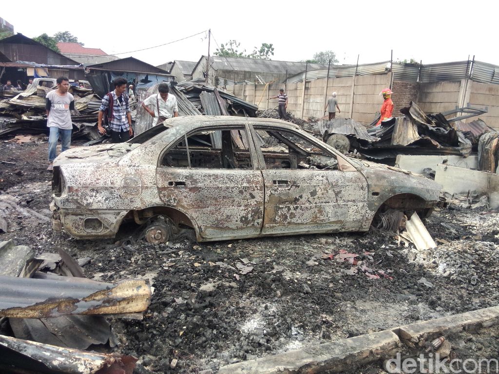 Kebakaran itu menimpa 50-an bengkel produksi mebel. Tampak kayu-kayu yang hangus. Begitu juga ada 4 mobil yang ikut terbakar dan tak dikenali lagi nomor polisinya. Kini hanya rangka besi yang menjadi tontonan.