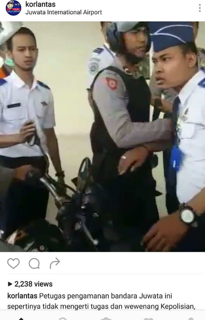 Di video yang diunggah itu dan dilihat detikcom, Selasa (9/8/2016) ada petugas Sabhara yang adu mulut dengan petugas berseragam Kemenhub. Dalam keterangannya, di akun @korlantas disebutkan kalau petugas Bandara Juwata itu tidak mengerti tugas dan wewenang kepolisian. Anggota Sabhara dilarang melakukan patroli dengan alasan wilayah kewenangan.