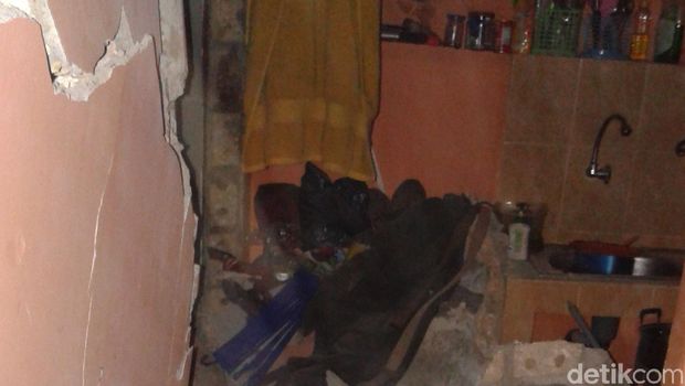 Saat ini di lokasi dipasangi dengan garis polisi. Rumah petakan itu terlihat retak-retak. Bahkan di dapur rumah tersebut terdapat bekas reruntuhan puing bangunan.