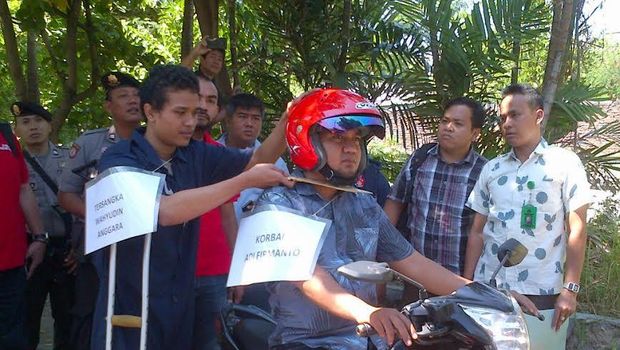 Ada 10 adegan yang diperagakan dalam rekonstruksi tersebut. Tercatat aksi penusukan ada pada adegan ke 8. Reka ulang disaksikan oleh penyidik, kuasa hukum, dan pengadilan, sedangkan warga hanya bisa melihat dari seberang sungai. Sementara itu tidak terlihat satu driver go-jek pun seperti saat gelar kasus.
