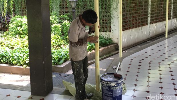 Sementara itu, di beberapa sisi gedung Wisma Negara tampak sedang dicat. Pekerja bahkan sampai naik ke bagian atas sisi gedung untuk mengecat.