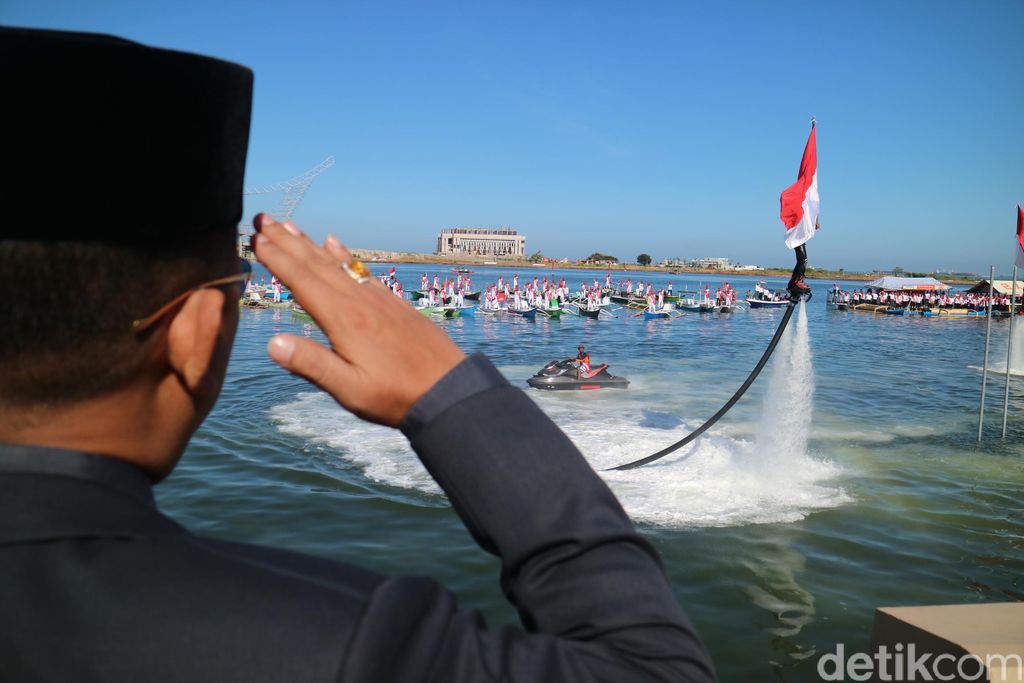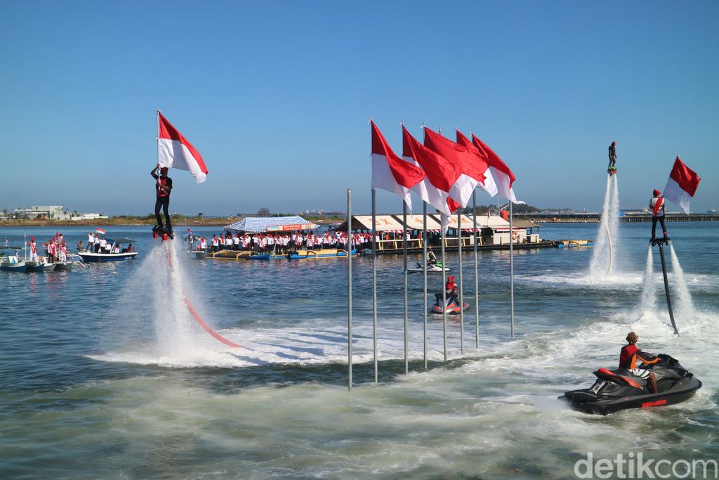 Upacara yang dipimpin Wali Kota Makassar Ramdhan "Danny" Pomanto bersama Ketua DPRD Makassar Farouk Betta dan Wakil Walikota Syamsu Rizal ini dilaksanakan di atas permukaan laut, di Pantai Losari, Rabu (17/8/2016), dengan menggunakan alat Flying Board dan Jetski.