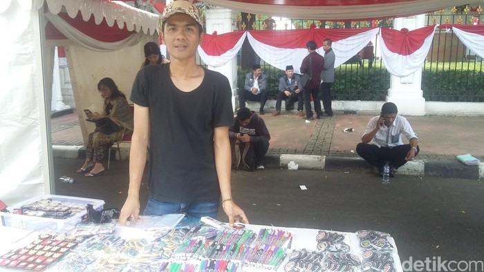 Contohnya saja Rori, pedagang berusia 35 tahun ini sudah sejak tahun kemarin menjajakan barang dagangan berupa pin Garuda Pancasila di area ring 1 di depan Istana Merdeka. Ia selain menjual pin juga menjual gantungan kunci berlogo Istana Kepresidenan.