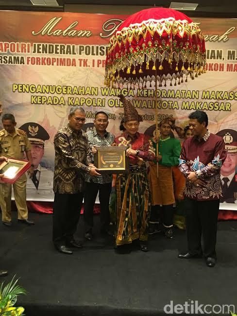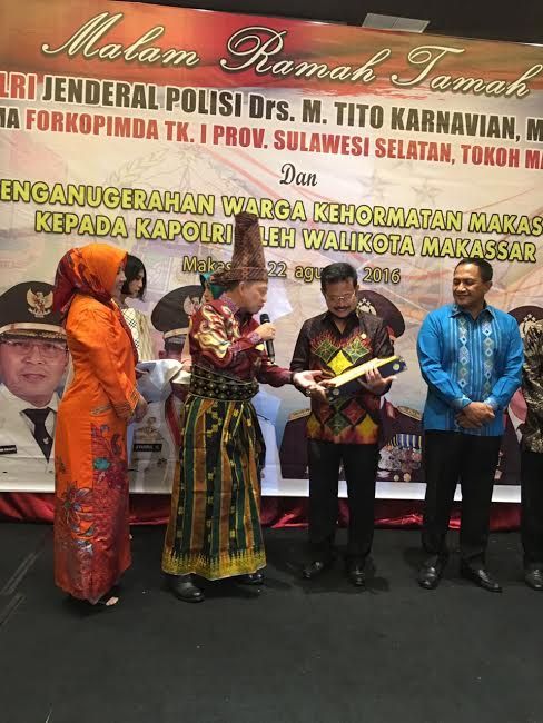 Acara digelar di Makassar, Senin (22/8/2016). Penghargaan diberikan Pemerintah Kota Makassar sebagai ungkapan kebanggaan dan kebahagiaan terhadap Tito yang pernah bertugas di Makassar.