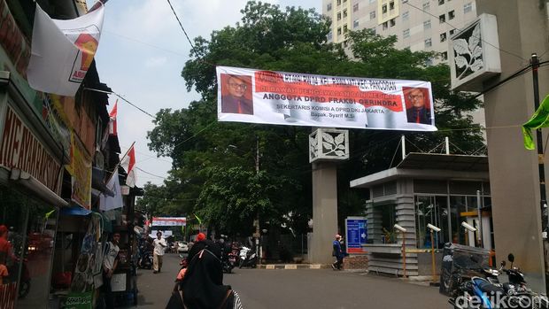 Ada juga bendera dan umbul-umbul Partai Gerindra. Di antara banner juga ada yang bertuliskan Kawasan RT 009 RW 04 Kel Rawajati Kecamatan Pancoran di bawah Pengawasan dan Mediasi Anggota DPRD Fraksi Gerindra. (erd/trw)