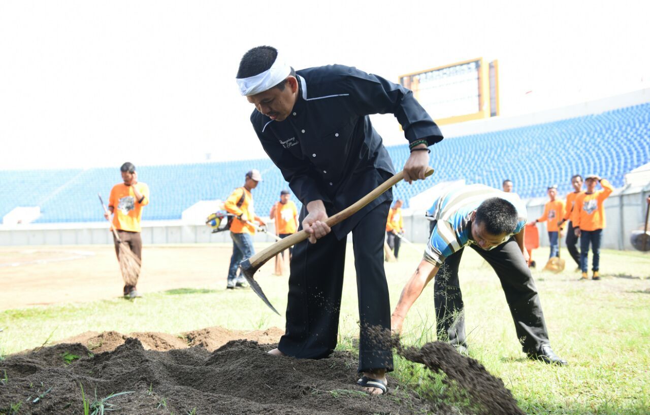 Para relawan mulai membersihkan lingkungan stadion sejak Kamis (25/8/2016) pagi datang dengan sejumlah peralatan mulai dari sapu, pacul, hingga alat pemotong rumput. Mereka membersihkan mulai dari bagian luar, gorong-gorong, hingga ke bagian sisi lapangan.