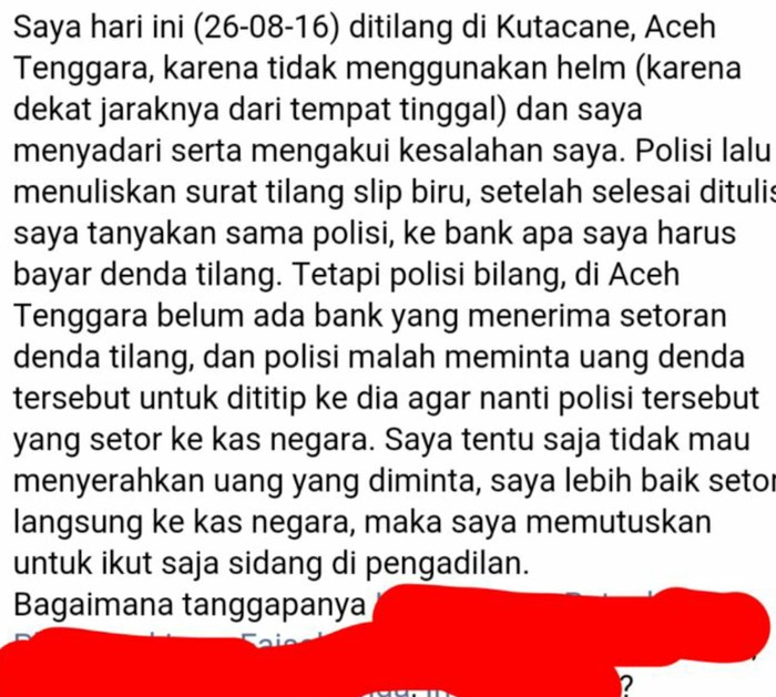 "Setelah selesai ditulis, saya tanyakan sama polisi, ke bank apa saya harus bayar denda tilang. Tetapi polisi bilang, di Aceh Tenggara belum ada bank yang menerima setoran denda tilang, dan polisi malah meminta uang denda tersebut untuk dititip ke dia agar nanti polisi tersebut yang setor ke kas negara," tulisnya.