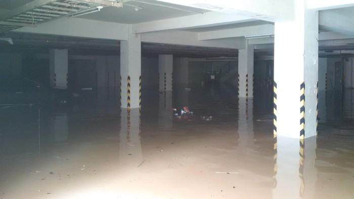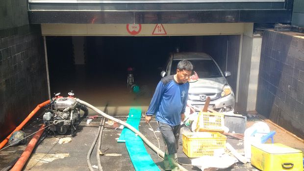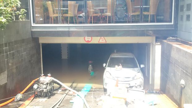Per pukul 12.00 WIB, debit air di dalam basement sudah berkurang signifikan. Seperti apa pemandangan di ruangan yang semalam dipenuhi air itu pun mulai terlihat.
