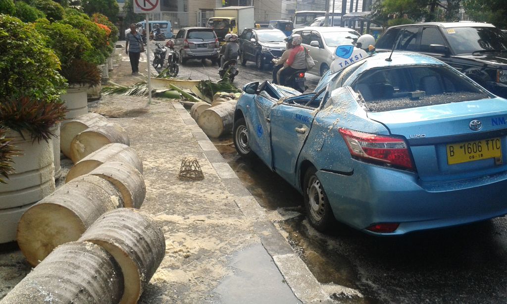 Pohon palem menimpa mobil Trimaizon di sebelah kiri. Sementara di bagian kanan mobil tidak terkena.